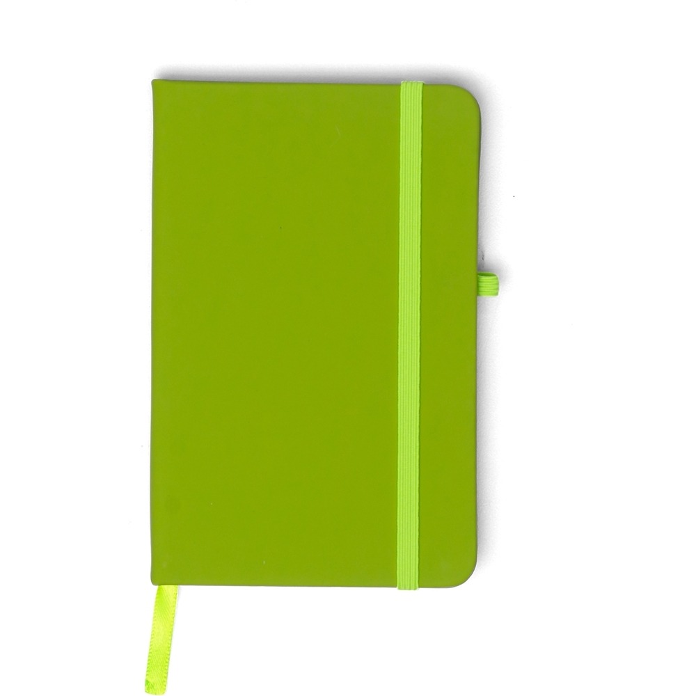 Descrição: Caderneta emborrachada com porta caneta elástico em nylon, marcador de página em cetim e fita elástica de nylon para fechar. Contém aproximadamente 80 folhas pardas pautadas.Tamanho total aproximado (CxL): 14,2 cm x 9,1 cm x 1,4 cm