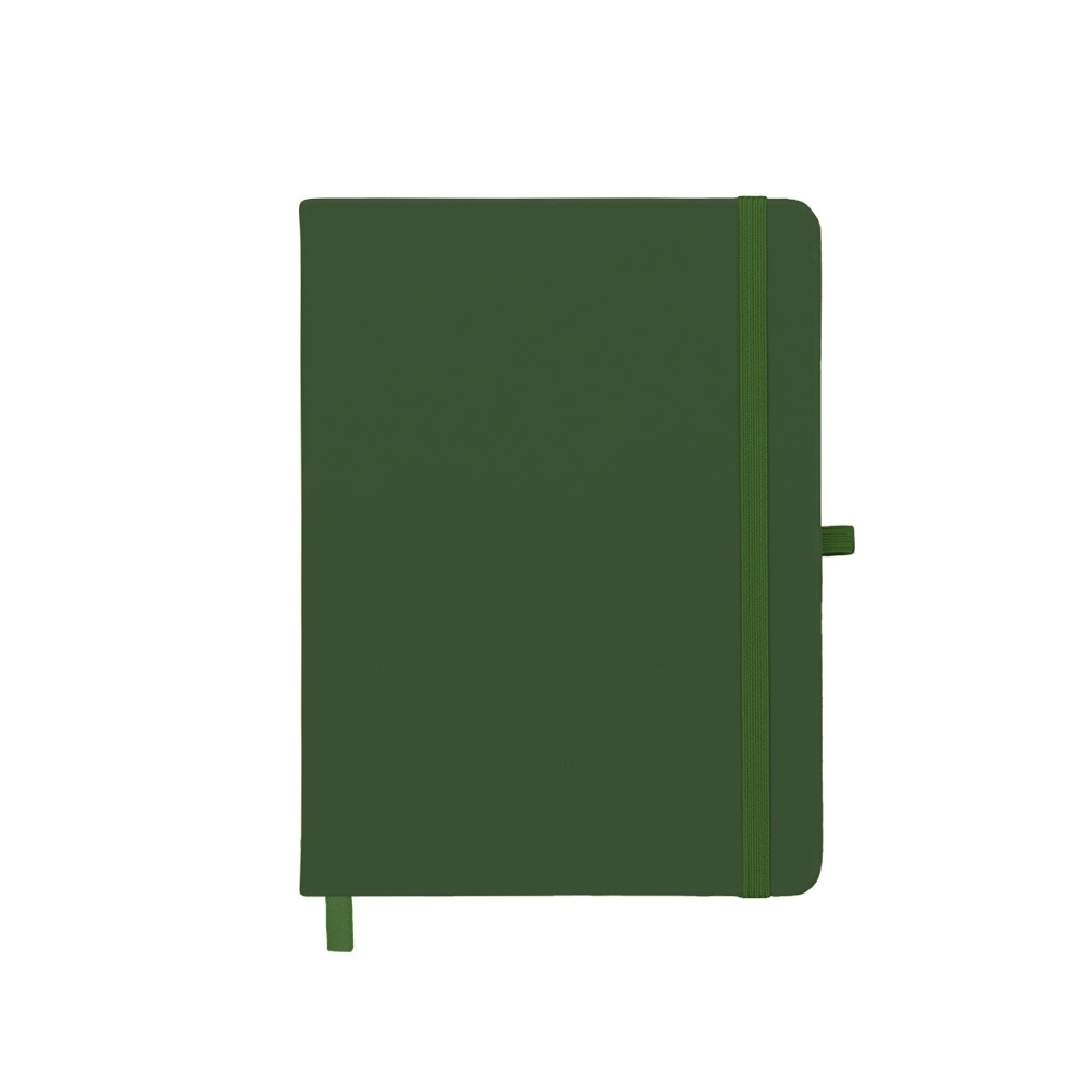 Caderneta emborrachada com porta caneta em nylon, marcador de página em cetim e fita elástica para lacre. Contém aproximadamente 80 folhas pardas sem pauta.